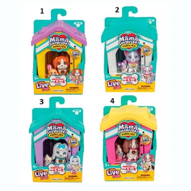 Περιεχόμενα συσκευασίας: 1 Μαμά Σκυλάκι (~5 εκ.), 4 έως 6 κουταβάκια (~2,5 εκ.), 1 σπιτάκι-playset (13×10 εκ.), 1 αξεσουάρ παιχνιδιού, 1 κάρτα οικογένειας, 1 φύλλο με αυτοκόλλητα, 1 συλλεκτικός οδηγός, 1 εγχειρίδιο οδηγιών.