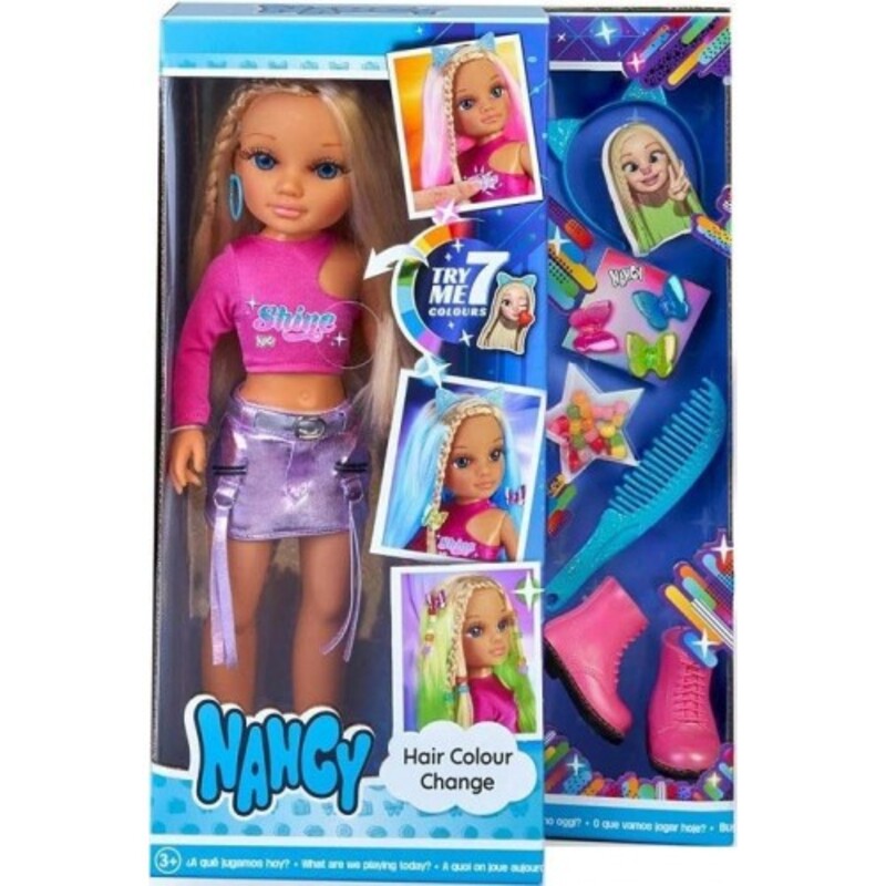 Μπορείτε τώρα να αλλάξετε το χρώμα στα μαλλιά της Nancy σε εφτά μοναδικές αποχρώσεις με τη χρήση μόνο ενός κουμπιού!!! Η λειτουργία είναι μαγική!! Πιέστε το κουμπάκι στο στήθος της και θα δειτε τα μαλλιά της να αλλάζουν χρώμα μαγικά!!Περιλαμβάνει και αξεσουάρ για να φτιάξετε διαφορετικά χτενίσματα για να ταιριάζουν με τα χρώματα των μαλλιών. Συγκεκριμένα περιέχει 3 κοκκαλάκια με σχέδιο πεταλούδας, χρωματιστές μπαλίτσες, μία στέκα με αυτάκια και μία χτένα.