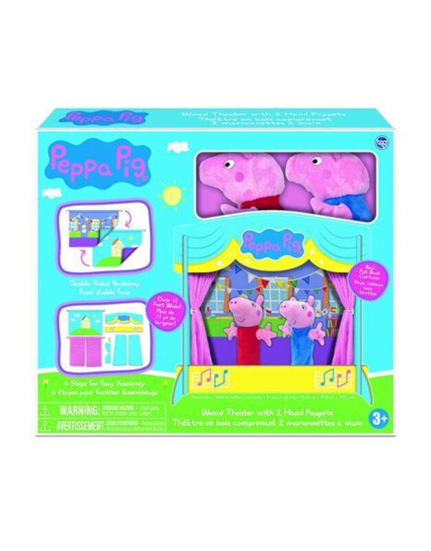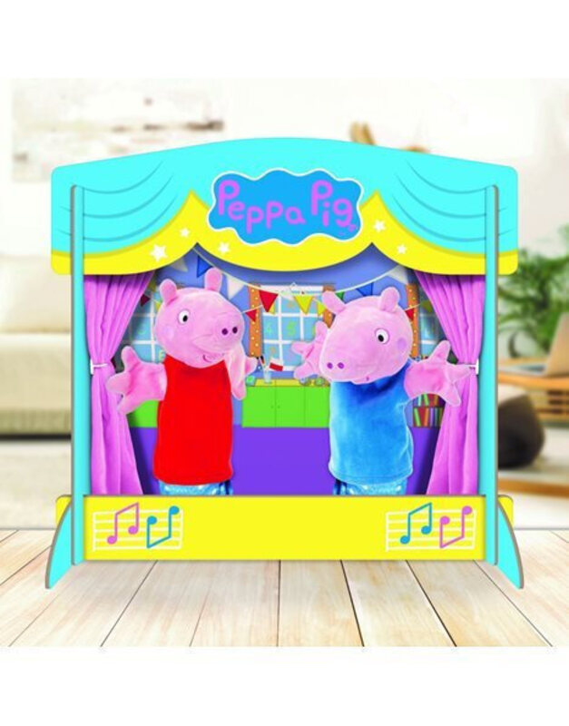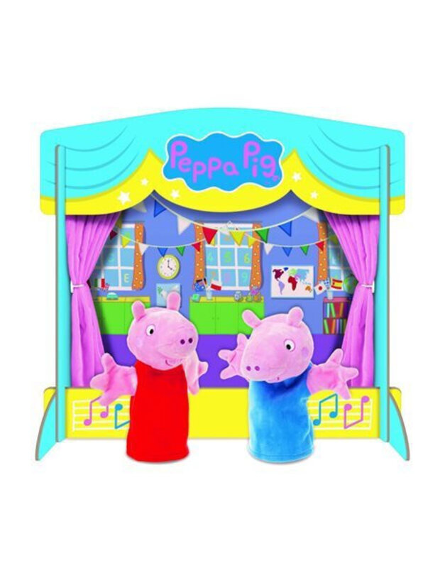 Σχεδιασμένο ειδικά για μικρά χεράκια, αυτό το ξύλινο κουκλοθέατρο αποτελεί τον πιο διασκεδαστικό και ευφάνταστο τρόπο παιχνιδιού. Διαθέτει λειτουργική κουρτίνα και 2 σκηνικά για να εμπνεύσει πολλές διαφορετικές ιστορίες ενώ περιλαμβάνει 2 λούτρινες μαριονέτες της Πέππα και του Τζορτζ. Μπορείτε να εμπλουτίσετε το παιχνίδι και με τις μαριονέτες της Μαμάς ή του Μπαμπά Γουρουνάκη (πωλούνται ξεχωριστά).