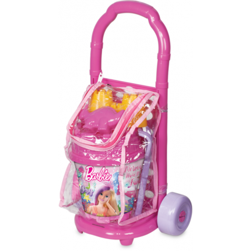 Αυτό το πλήρες σετ περιλαμβάνει: τρόλεϊ μεταφοράς και αποθήκευσης, μεγάλο κουβαδάκι Barbie, φτυάρι, τσουγκράνα, σίτα και 2 φόρμες.